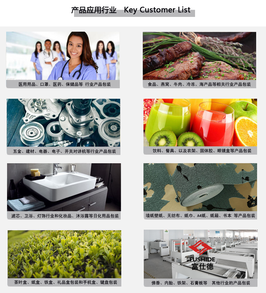 茶葉、食品、衛浴、化妝品、 壁紙、 濾芯、保健品、五金、電子、塑膠、建材、醫藥、地板、飲料、啤酒、礦泉水、易拉罐、日化用品、家居用 品、工業產品、文具、印刷品、陶瓷工藝品、橡膠制品、膠帶、彩盒、賀卡、相冊、相框等各行業不同形狀、單件、組合包裝產品提供針對性設備機型,也可根據客戶實際情況進行定制開發。